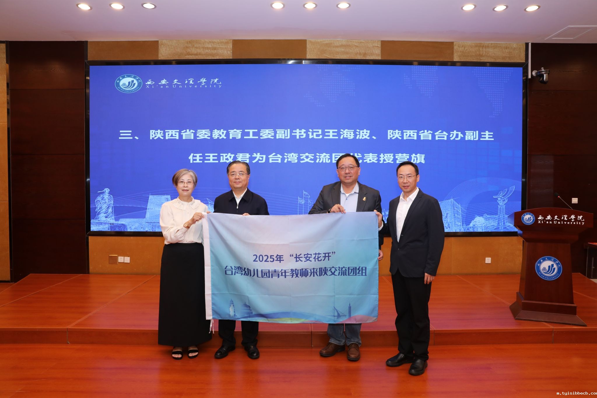 最后,陕西省委教育工委副书记王海波与陕西省人民政府台湾事务办公室副主任王政君共同为台湾交流团代表授营旗,标志着2025年“长安花开”台湾幼儿园青年教师来陕交流活动正式拉开帷幕。