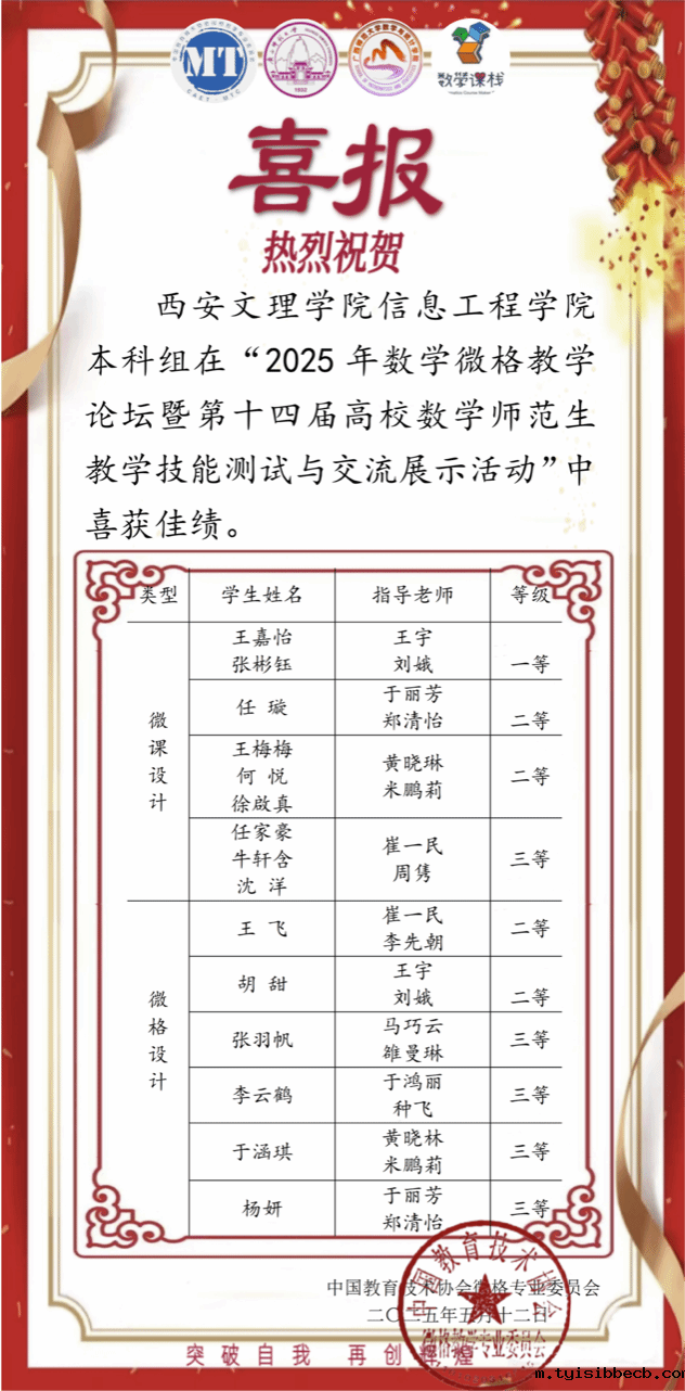 5月13日,信息工程学院参赛队赴桂林参加第14届高校数学师范生教学技能测试与交流展示活动”教学能力大赛(华文杯),取得优异成绩。此次比赛,信工学院获一等奖1项、二等奖4项、三等奖5项,参赛队员全员获奖。